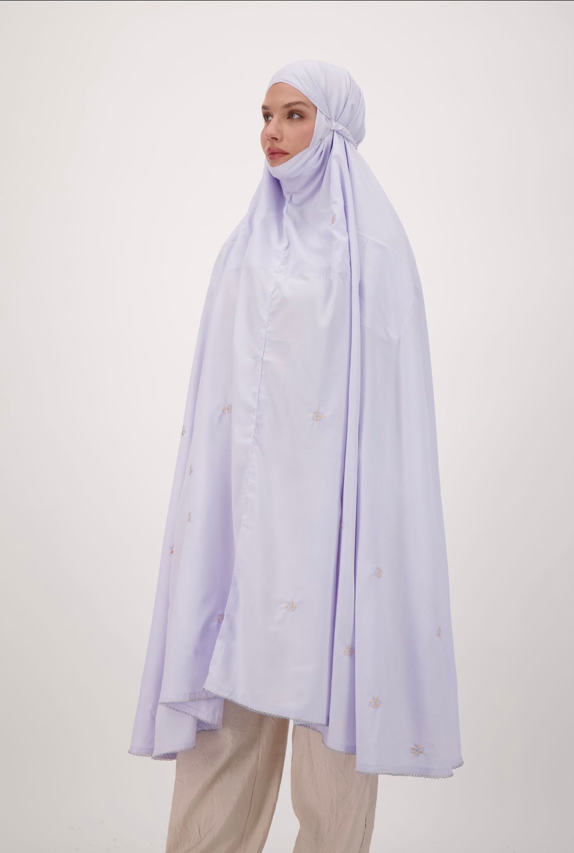 Gorgeous namaaz chadar white with peach, purple , blue and pink etc flowers scattered all over. The face area is stitched as shown with double fabric on the head part.